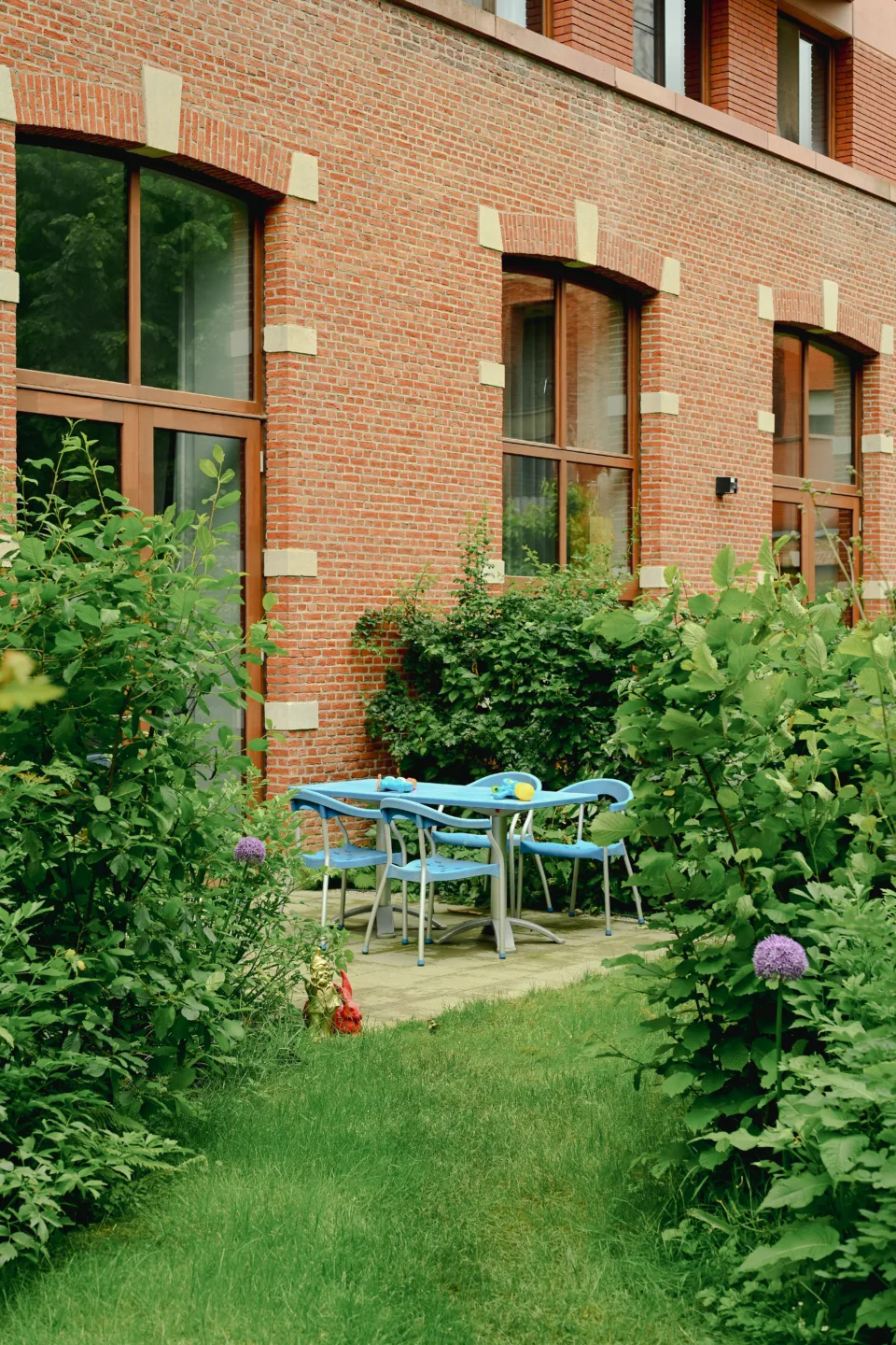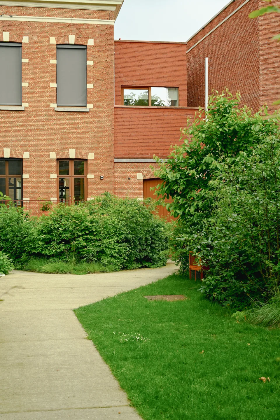 De voormalige betegelde speelplaats werd zo volledig omgevormd naar een collectieve groene diverse ruimte waar plaats is voor fauna, flora, water, recreatie, groenten en fruit,… Verhardingen werden hierbij maximaal beperkt en waar mogelijk uitgevoerd in waterdoorlaatbare materialen.