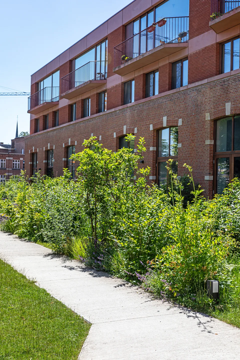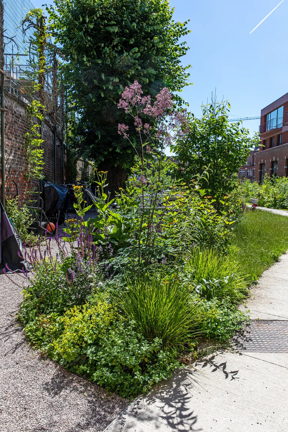 De vegetatiestrategie focust op de inbreng van een gelaagde vegetatie met wisselende densiteiten gebaseerd op structuurrijke mantelzoomvegetaties. Deze vegetaties kaderen de site groen in en mediëren de overgangen tussen private zones en de gedeelde tuinzone. Door te spelen met transparantie en een opbouw met hogere vaste planten ontstaat een gevoel van geborgenheid zonder scherpe grenzen te creëren; de vegetaties zorgen voor een natuurlijk aanvoelen van de site en een voelbare aanwezigheid van natuur. Het aanwezige boomkader van Zomerlindes (Tillia platyphyllos) wordt aangevuld met inheemse struiksoorten (Acer campestre, Corylus avellana, Rosa canina,…), (hogere) vaste planten en grasachtigen.
