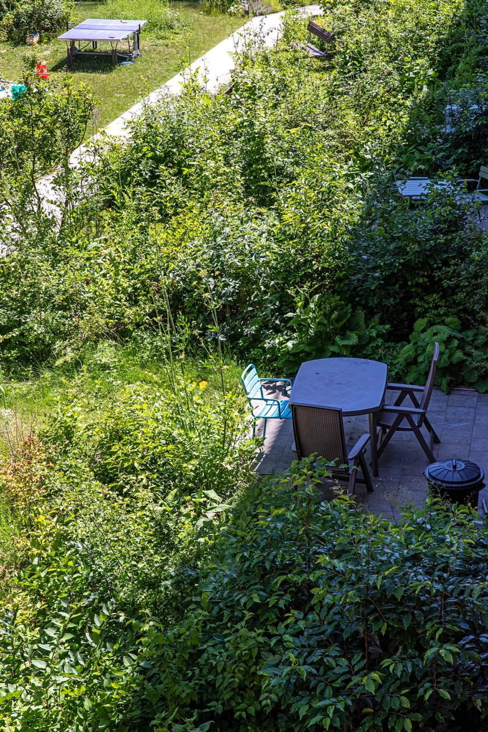 The vegetation strategy employs a multilayered planting scheme with variable densities inspired by natural edge (mantelzoom) habitats. This approach mediates transitions between private and communal zones, fostering a sense of enclosure through transparent layering and taller perennials without rigid boundaries. The existing Tilia platyphyllos (small-leaved lime) canopy is supplemented with native shrubs such as Acer campestre (field maple), Corylus avellana (hazel), and Rosa canina (dog rose), alongside diverse herbaceous perennials and grasses, enhancing the ecological value and creating a naturalistic green framework.
