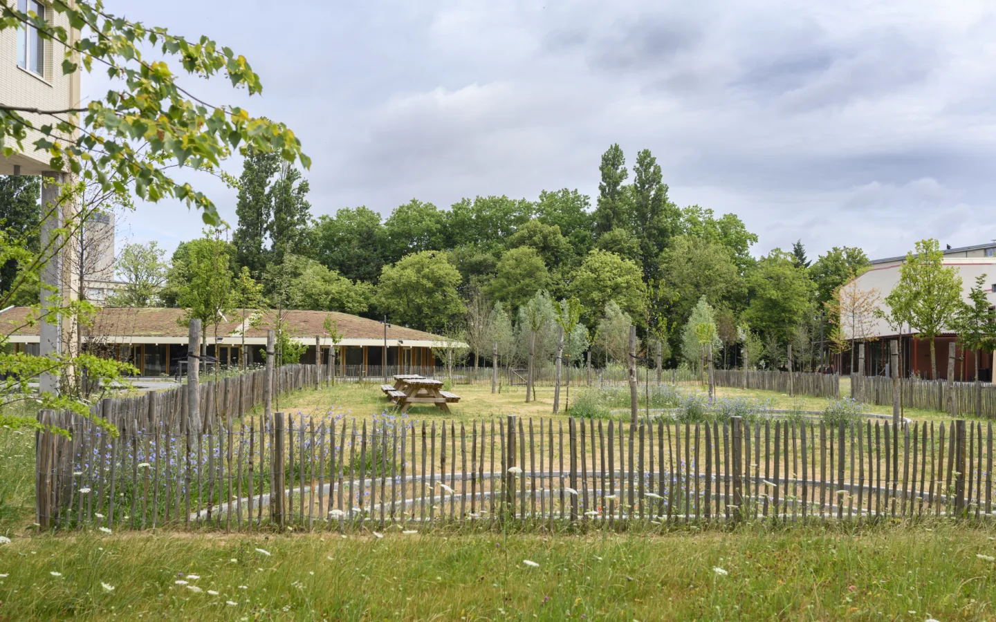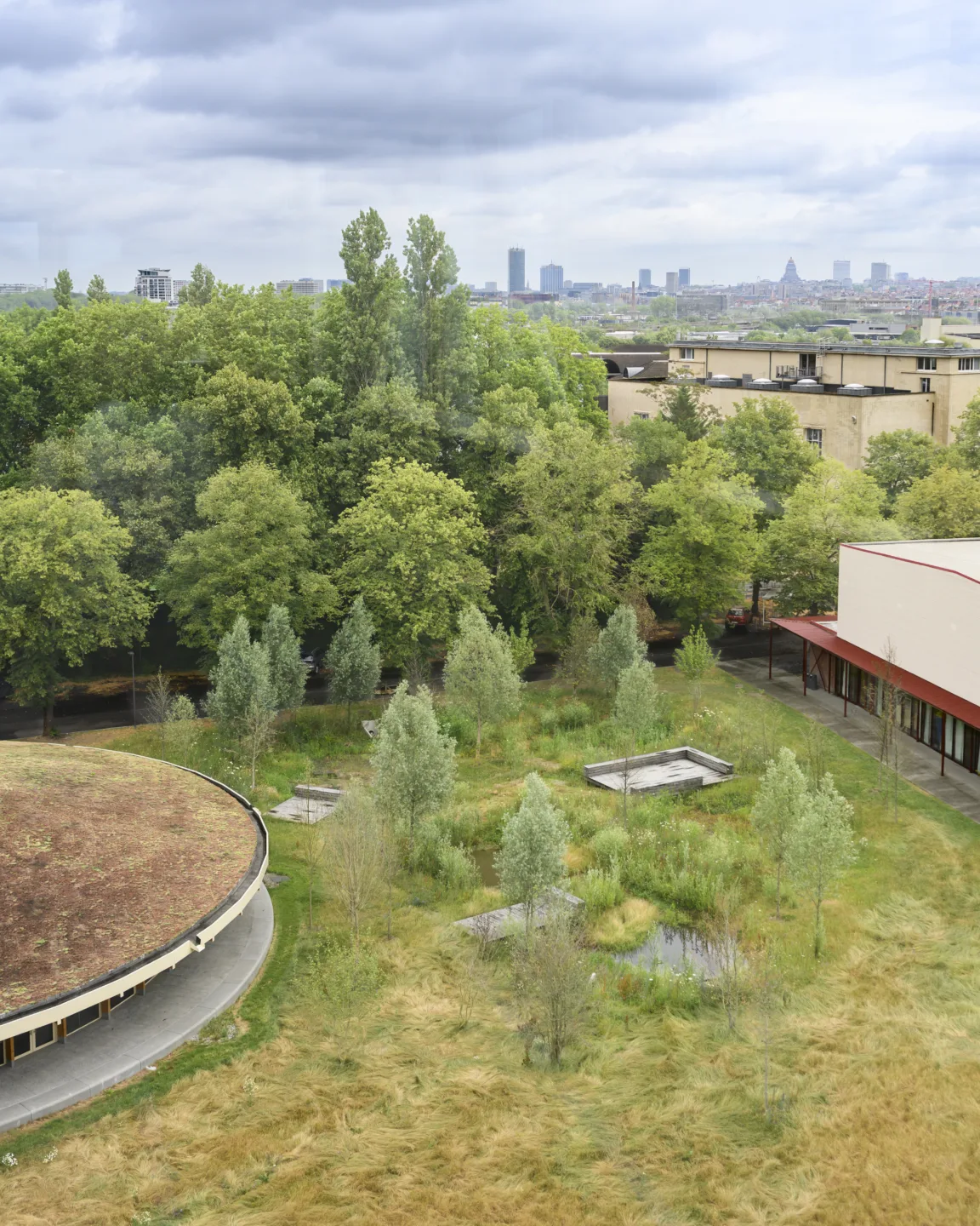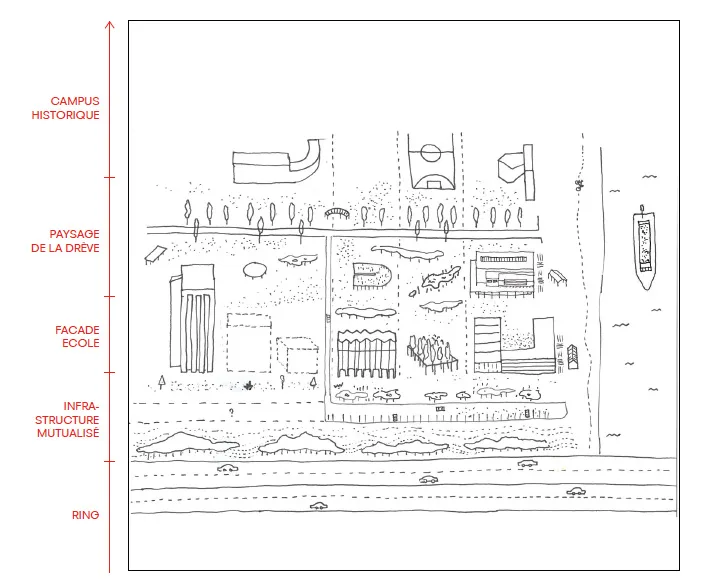 The redevelopment of the CERIA campus is driven by a strong ambition to support innovative and active learning methods. Situated between the Brussels Ring Road and the canal, the site benefits from an existing and valuable landscape structure, which offers a fertile foundation for transformation. The existing tree-lined avenue — the site’s landscape backbone — is reimagined as an accessible axis that opens the campus toward the surrounding neighbourhood and connects it to the canal. With a focus on ecological and architectural integration, enhancing biodiversity and shaping a harmonious educational landscape are central objectives.