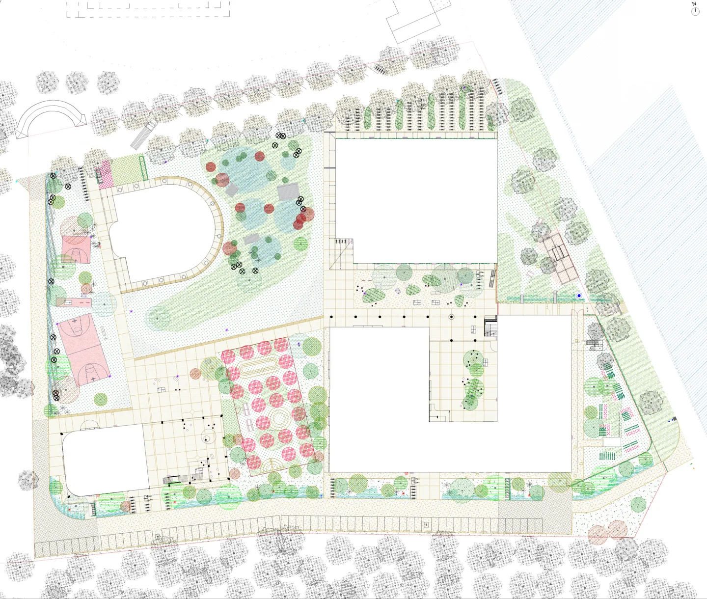 The outdoor environment is designed as a multifunctional space, capable of accommodating cultural events, community gatherings, and educational initiatives. Through thoughtful zoning and inviting spatial design, the landscape becomes both an open-air classroom and a meeting place where diverse educational institutions can come together. In doing so, the project realises its ambition to create an open, dynamic, and innovative campus — one in which nature plays an integral role in both spatial structure and learning processes.
