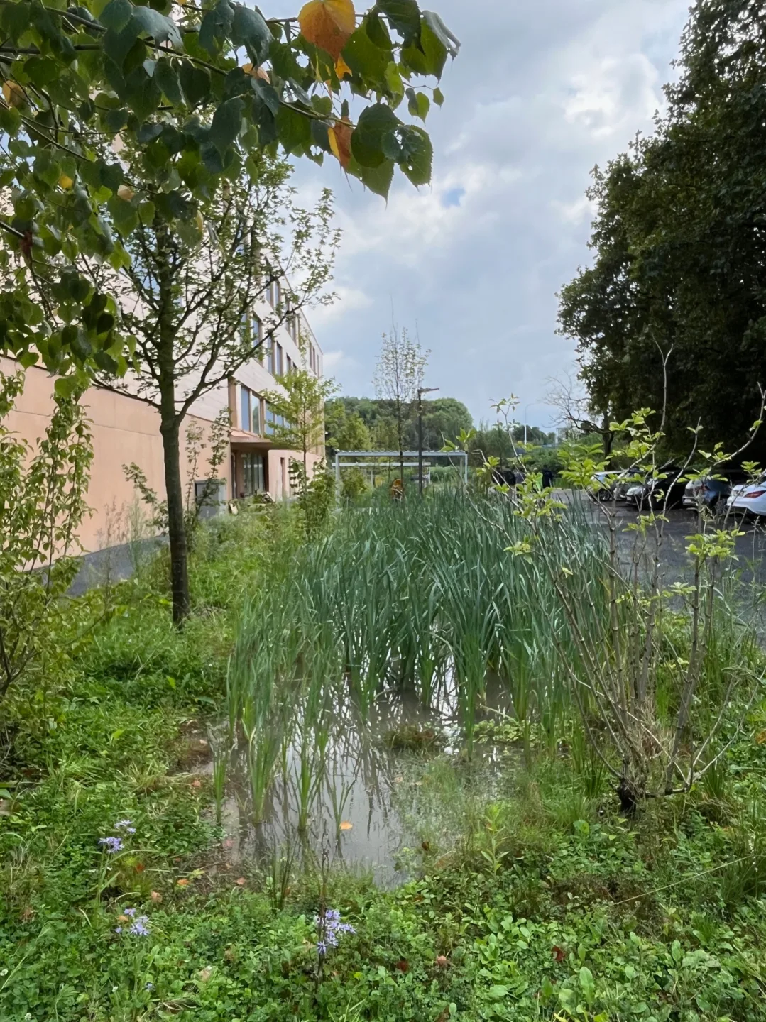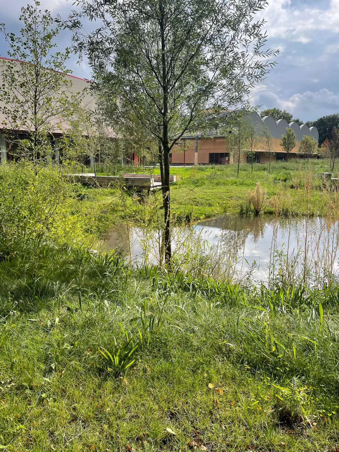 Natuurlijk vormgegeven wadi’s maken natuurlijke infiltratie van regenwater mogelijk en creëren ecologische waardevolle habitats; ze nodigen uit tot ontspanning en buiten leren buiten de klassikale omgeving.
