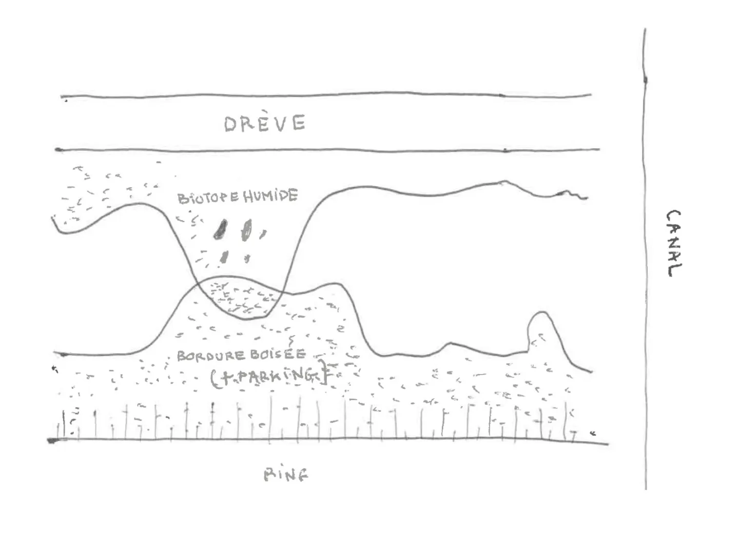 A forest buffer along the Ring Road forms a visual and ecological screen, within which parking zones are discreetly integrated. This green belt extends into the campus, generating microclimates and diverse habitats that contribute to ecological resilience. - Wetland Zones