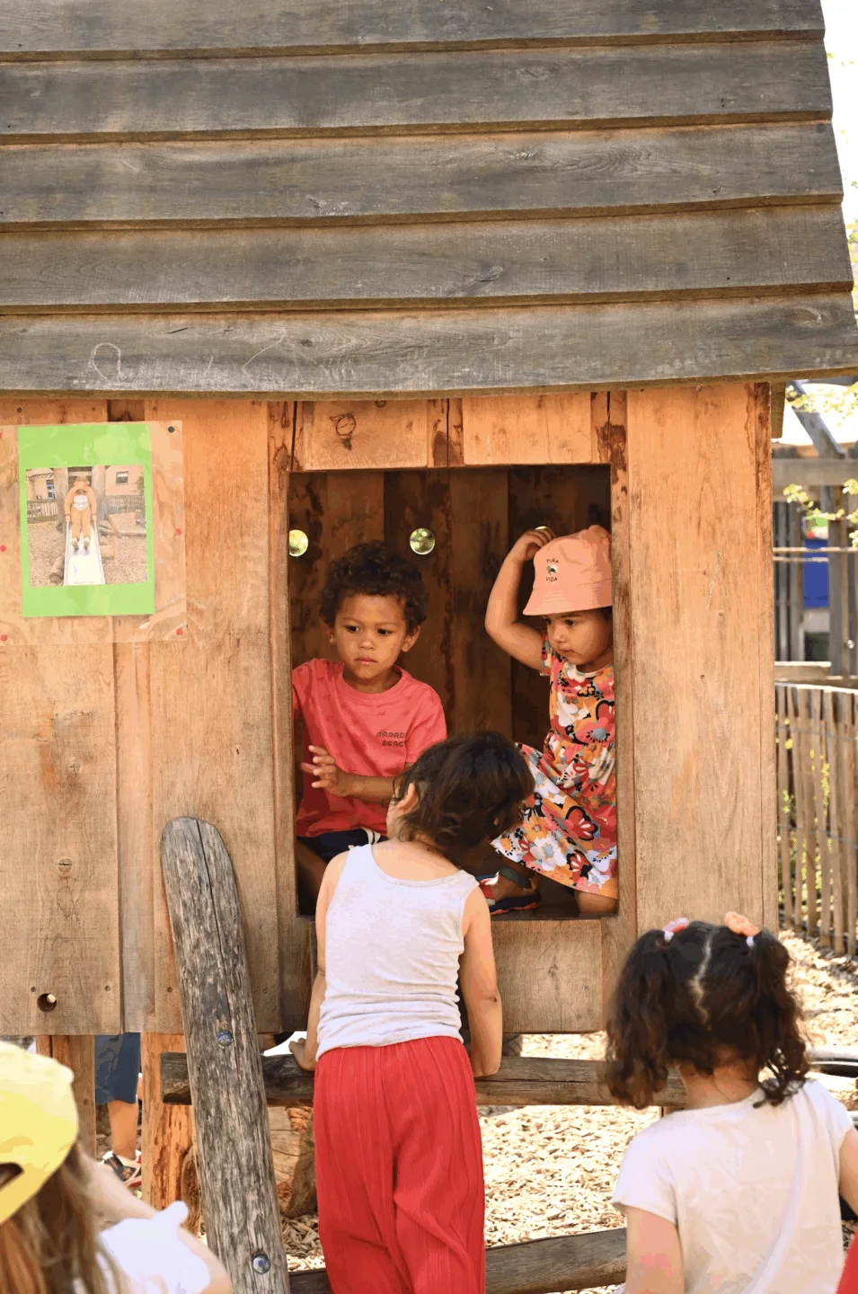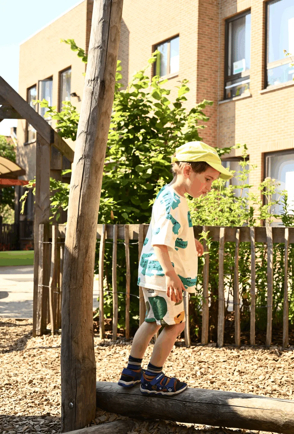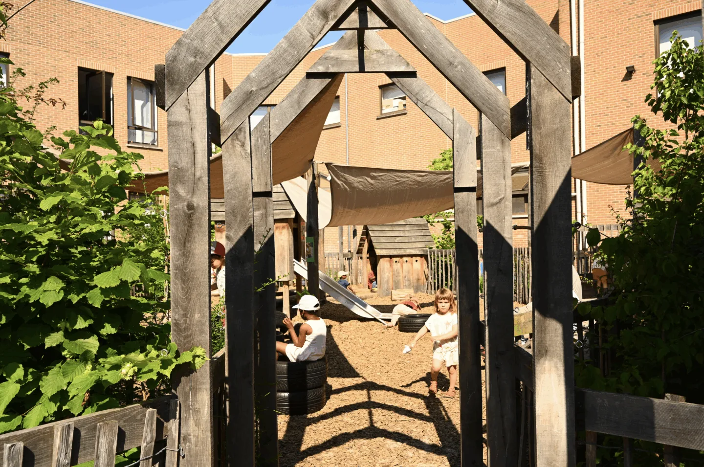 A large section of the playground was depaved and restructured as a vegetated zone framed by a green belt composed of trees, shrubs, perennials, and climbing plants. Within this zone, a layered program was introduced: an outdoor classroom, an adventure area focused on active play, and a play kitchen encouraging social and creative play. The vegetated buffer creates an immersive green atmosphere, while also visually and physically separating the natural zone from the more dynamic, paved playground. This deliberate spatial zoning helps reduce conflicts between different forms of play.