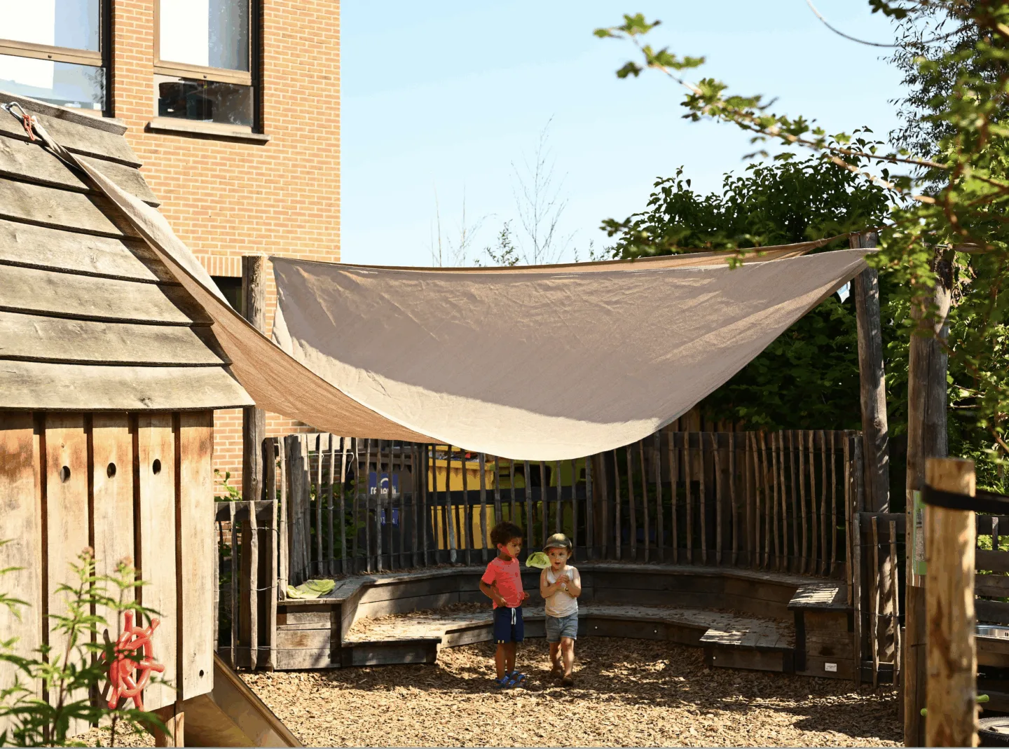 In 2021, the preschool De Speelkriebel initiated a transformation project in collaboration with Plant en Houtgoed, supported by public subsidies, to radically depave and integrate green on their previously grey and hardened playground. The goal was to create a vibrant, natural play environment with a diverse range of sensory and play stimuli, carefully integrated into a coherent and logical spatial layout.