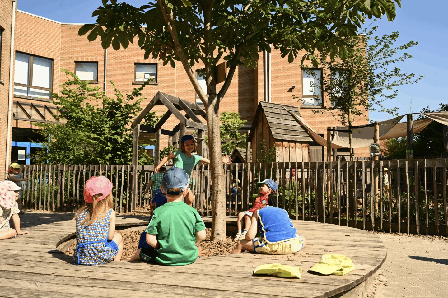 Hierbij werd een grote zone onthard en voorzien van een vegetatie-gordel opgebouwd uit een combinatie van bomen, struiken, vaste planten en klimplanten. De ontharde lob werd opgeladen met een programma van een buitenklas, een avontuurlijke zone gericht op grove motoriek en een speelkeuken voor spelvormen rond fijne motoriek. Door de vegetatie-gordel ontstaat een immersief groen kader in de ontharde zone en wordt deze zone visueel en fysiek afgebakend van de verharde actieve speelplaats. Op deze manier wordt het conflict tussen verschillende spelvormen geminimaliseerd. Aansluitend op de grote ontharde lob werd een overdekte zandbak die ook bij regenweer inzetbaar is ingebracht en de verharde zone kreeg een programmatie gericht op actief spel met fietsparcours en klauterparcours.