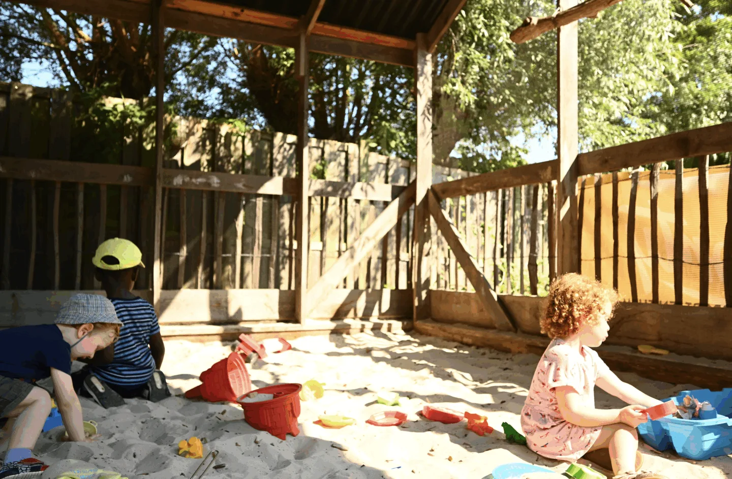 Adjacent to the depaved zone, a covered sandbox was installed, allowing for year-round use, including during rainy weather. The remaining paved area was redesigned with a focus on active play, including a cycling track and climbing structures.