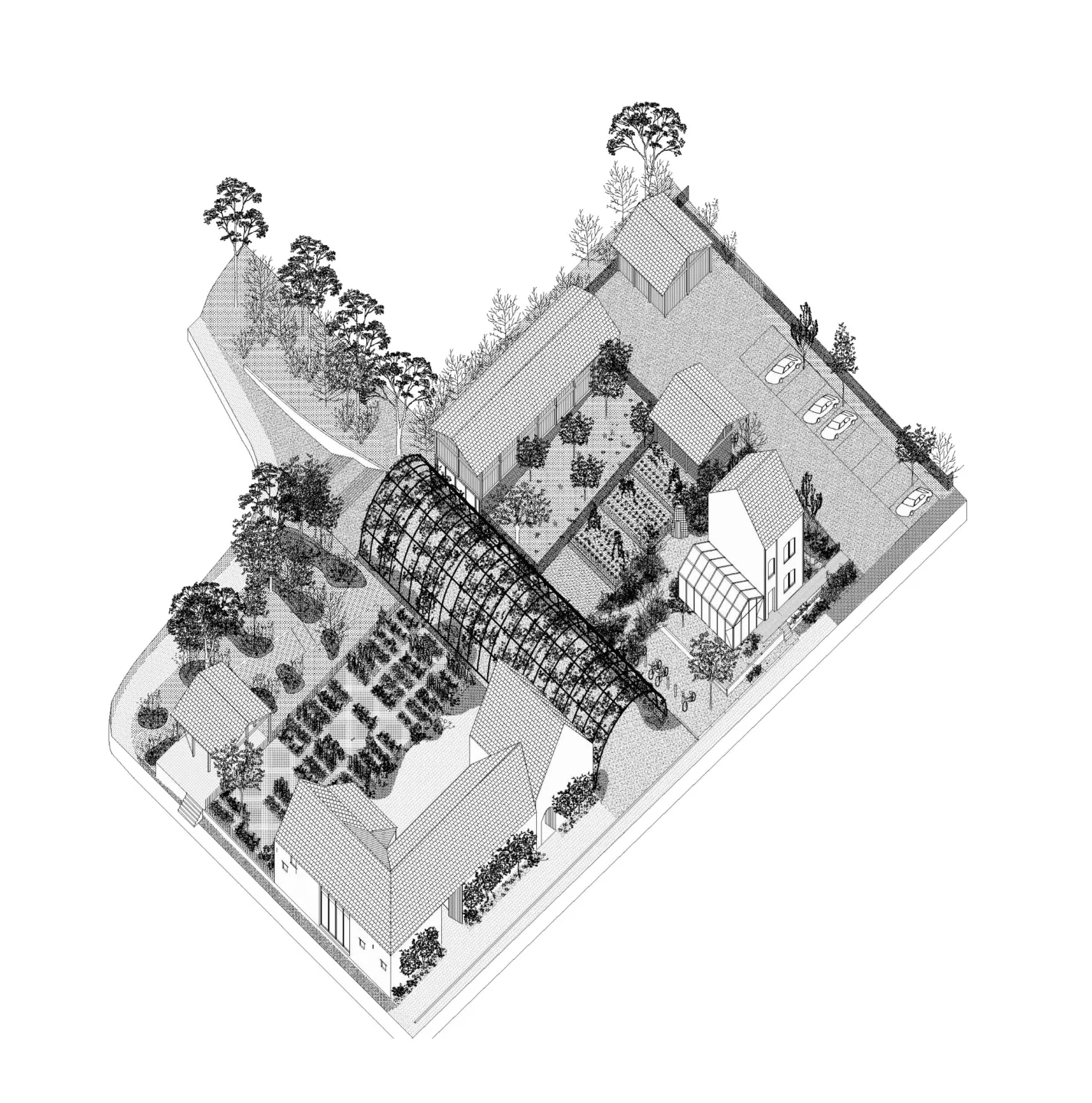 In response to a call from Brussel Leefmilieu, a comprehensive proposal was developed and managed for the adaptive reuse of a former farmstead and adjacent residential building. The site is programmed as a mixed-use hub focusing on sustainable agriculture and transition projects, intended for occupation by four non-profit organizations upon completion. Both the landscape and built heritage reflect a strong ambition for sharing, exchange, and collaboration.
