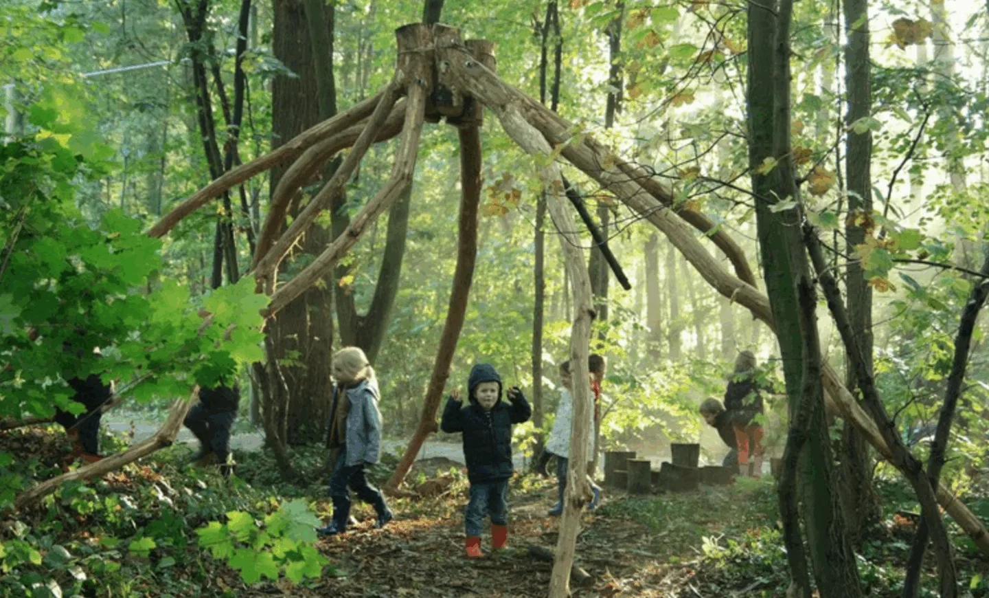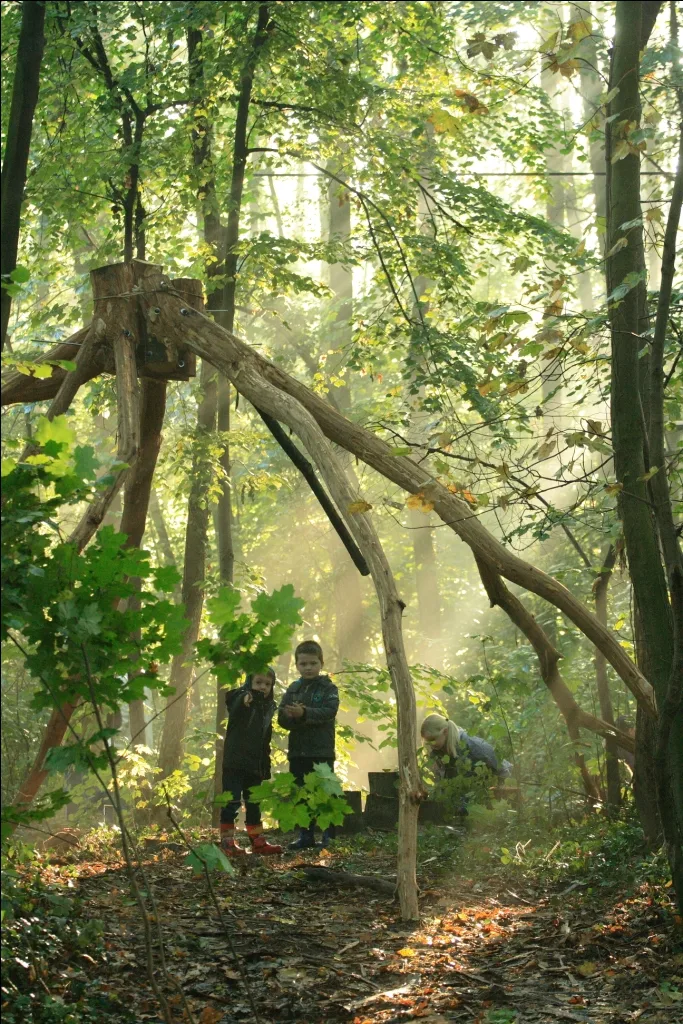Two types of interventions were introduced to address this: a stepping-stone climbing trail through the ditch and a composition of whimsical “spider” structures dispersed throughout the forest. The climbing trail invites exploration and clearly signals the location of the play zone. Its adventurous design acts as an additional stimulus for play. The spider structures, visible through the trees, encourage forest exploration and active engagement. Reminiscent of makeshift camps, they serve as starting points for further construction, continuously evolving with materials added by playing children.