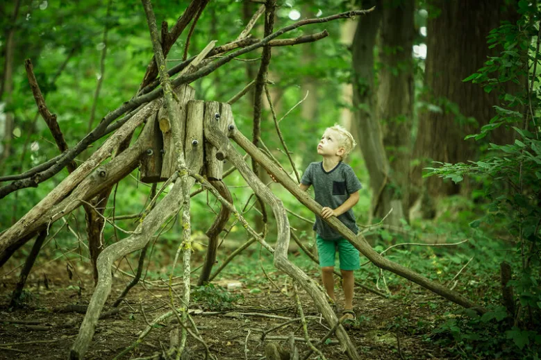The entire installation was built using materials sourced from the play forest itself. No external timber was introduced; in consultation with the forest ranger, suitable treetop wood from a prior felling operation was selected for reuse. The result is a fully natural and circular intervention that inspires wonder and play, while minimizing impact on the forest ecosystem.
