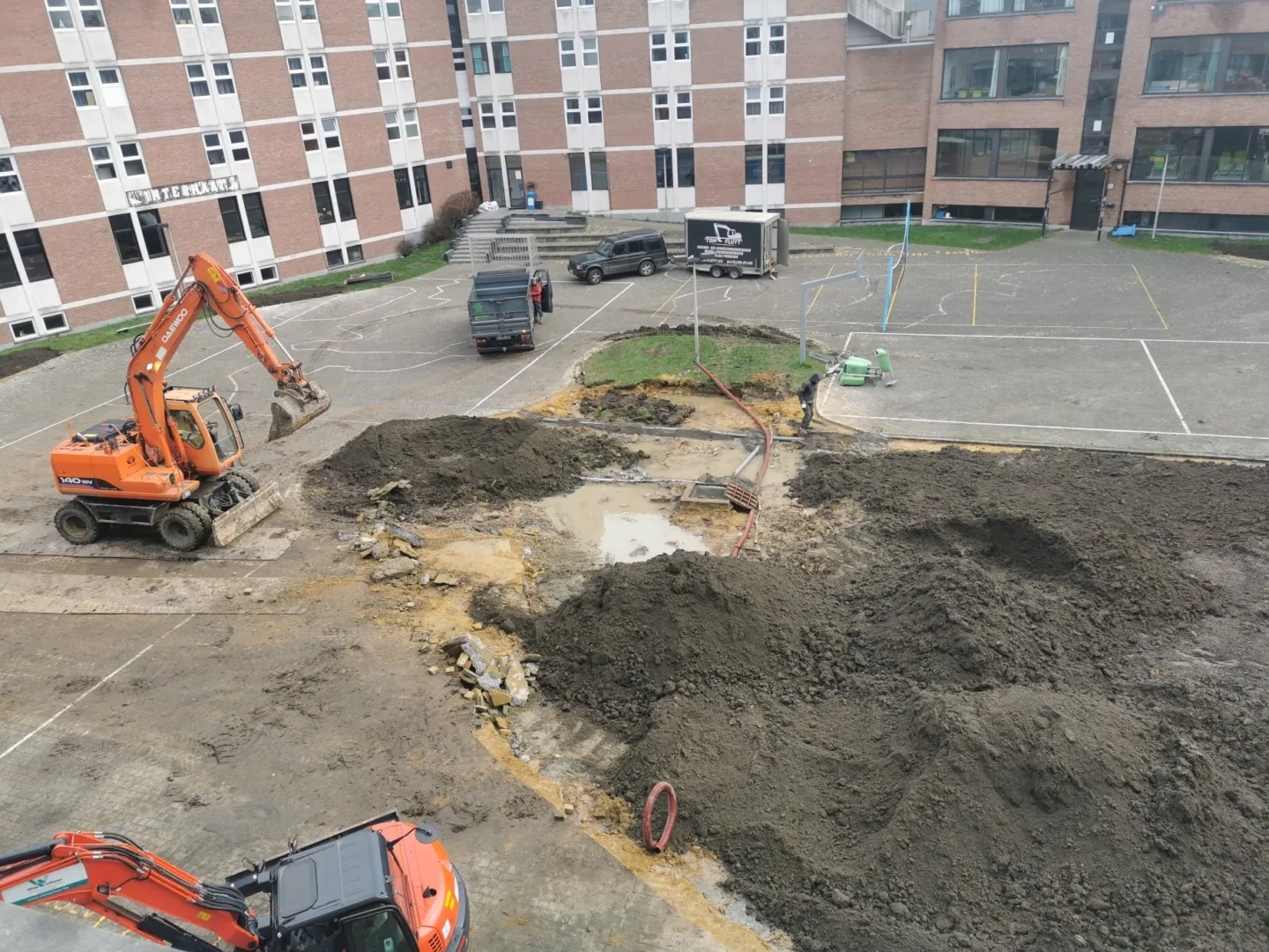 In early 2020, Atheneum Redingenhof joined a neighbourhood initiative focused on the depaving and greening of the Volmolenlaan and its surroundings. The school embraced the ambition of combining the large-scale removal of hard surfaces—more than 1,000 m² of paving—with a broader upgrade of the outdoor environment in terms of atmosphere and the variety of play stimuli. Through a participatory process involving school leadership, teachers, and students, the design framework, programmatic layout, and planting strategy were collaboratively developed. The first phase of implementation began in autumn 2021.