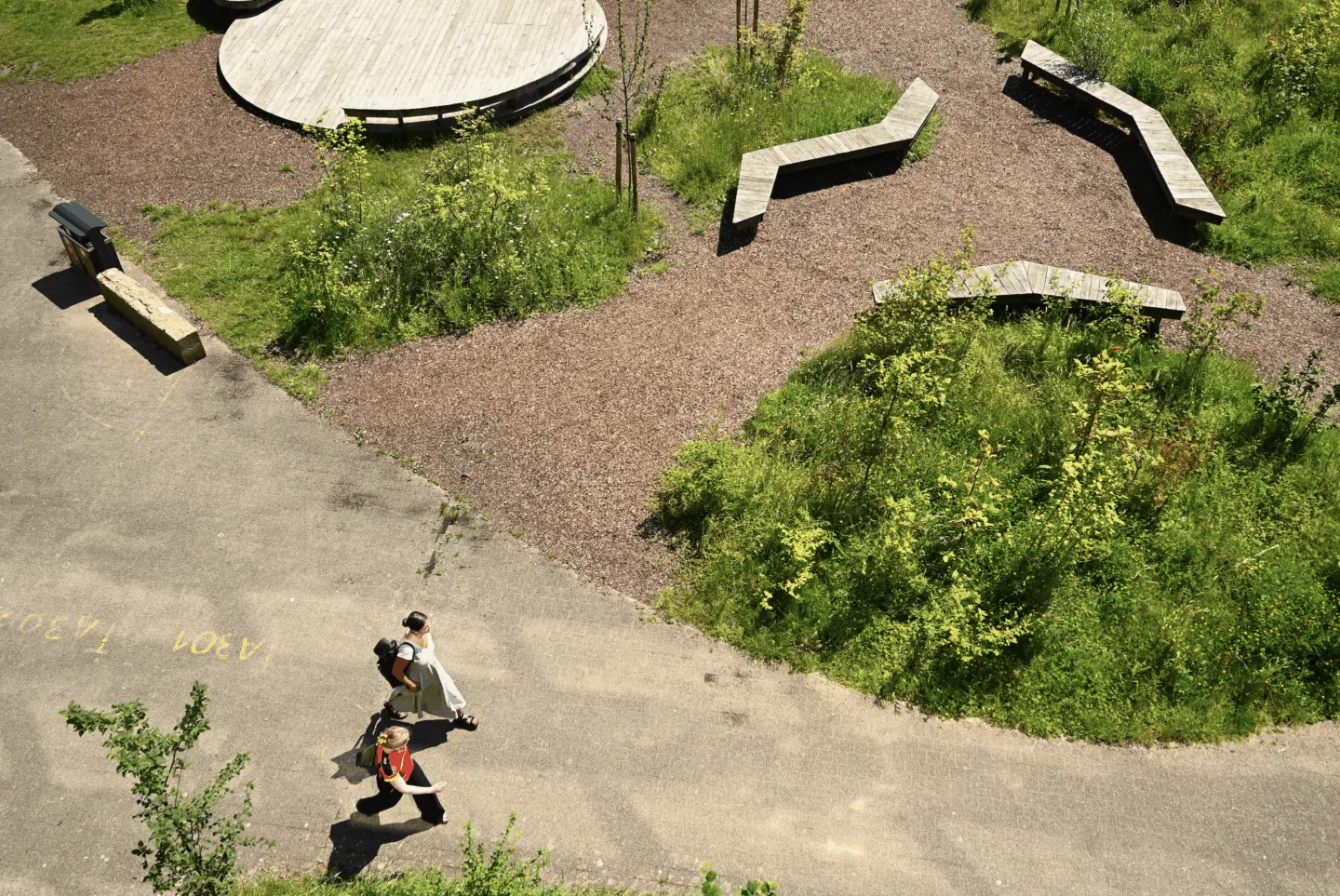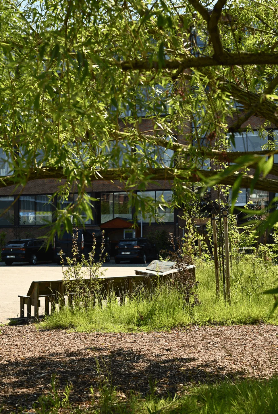Water infiltration was a key priority during the depaving works. Both playgrounds were equipped with wadi systems to collect rainwater not only from the playground itself but also—via a newly implemented aquaduct system—from disconnected rooftops. These water-rich zones were used as an opportunity to further diversify the planting palette, introducing moisture-loving species to enhance ecological value.