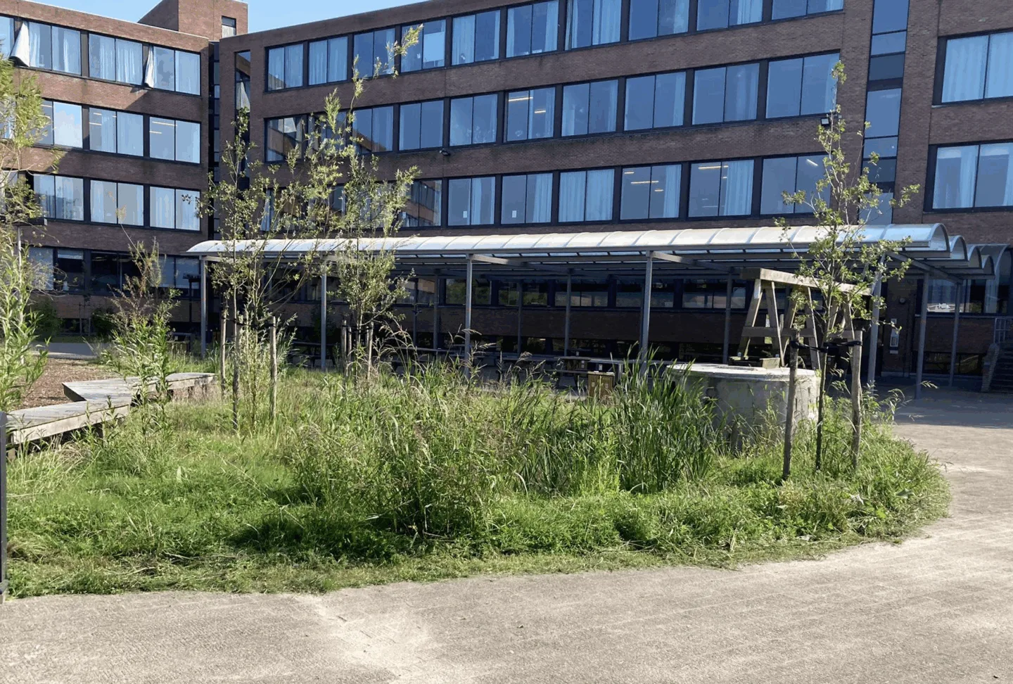 On the secondary school playground, the design aimed to strike a balance between open space and programmed zones. Various seating and informal gathering areas were integrated alongside spaces for active recreational activities such as ball juggling, hacky sack, frisbee, and more. To accommodate this, existing grass strips along building façades were expanded and planted, and a large central zone was depaved and restructured with seating infrastructure, small stages, rain gardens (wadi’s), and diverse planting beds.