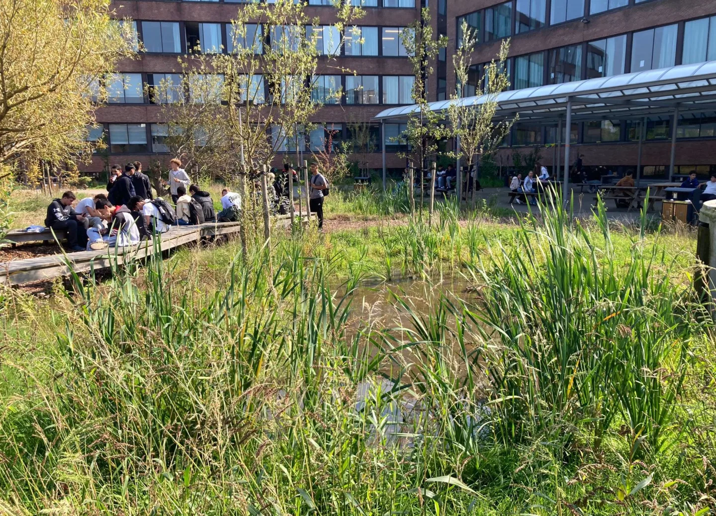 The project was partially developed through a multi-year co-creation process. Students in the horticultural program planted shrubs, trees, and perennials, while students from the woodworking track co-designed and built seating and lounging elements.