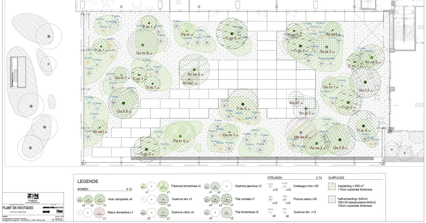 The outdoor space around the ZIN complex is being de-paved and restructured with a layered vegetation structure that extends the greenhouse ecosystem down to street level. This results in biodiverse urban biotopes that are woven into the public domain and contribute to the greening and climate resilience of the North District.